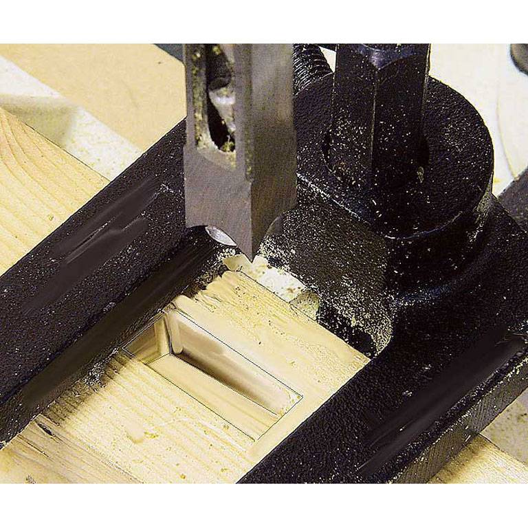 Будучи компактным и мобильным, JBM-5 оснащён всеми механизмами и системами, облегчающими работу. Есть газовая стойка для компенсации веса сверлильной части, реечный механизм подачи с длинным рычагом, продольный упор и вертикальный прижим заготовки. Простота и точность установки сверла-долота обеспечивается комплектом переходных втулок - достаточно выбрать нужную и зажать внешнюю часть винтом, предварительно сориентировав плоскость по упору заготовки. Для фиксации сверла предусмотрен трехкулачковый патрон с удлиненным ключом.