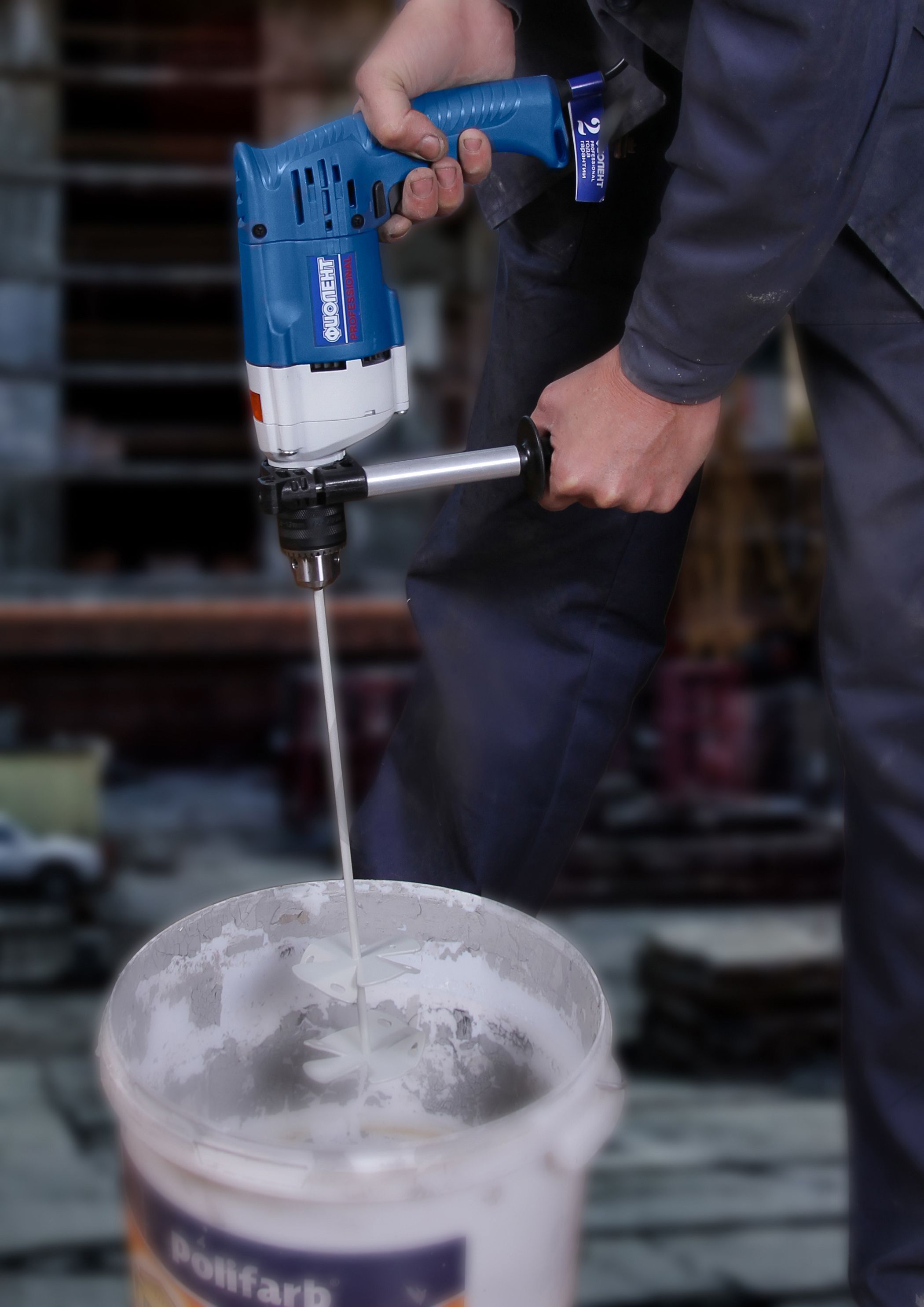 Многофункциональный инструмент, используемый для перемешивания материалов различной степени вязкости. Также она подходит для сверления отверстий в стали, цветных металлах, пластмассе, древесине. Ещё данной дрелью можно завинчивать/отвинчивать шурупы и бурить отверстия в бетоне, кирпиче и камне. Модель снабжена ключевым патроном 13 мм. Кейс решает вопрос хранения и транспортировки.