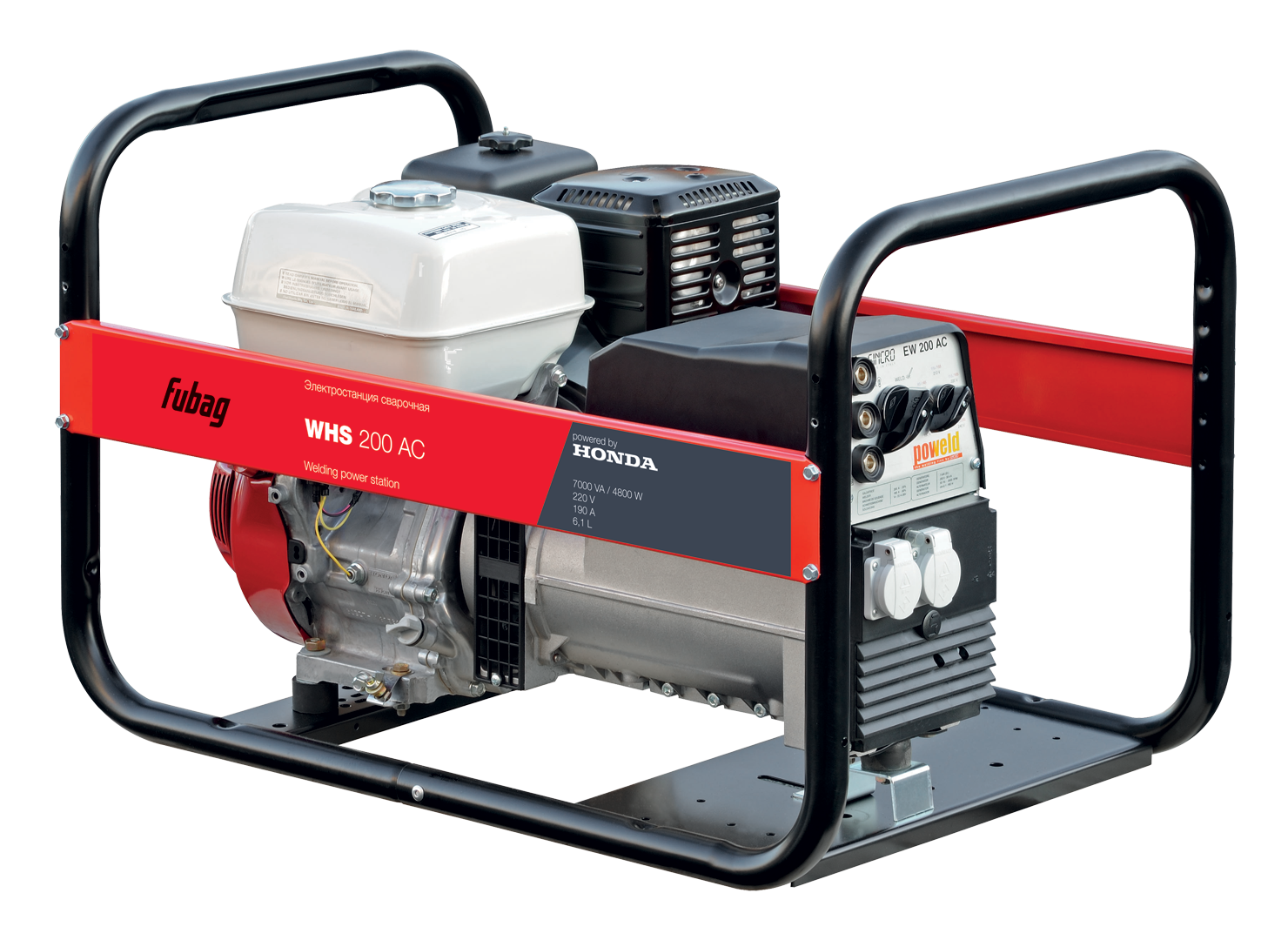 Удобная для транспортировки сварочная электростанция переменного тока оснащена надёжным и экономичным профессиональным бензиновым двигателем Honda GX OHV. Топливный бак объёмом 6,1 литра позволяет станции работать без остановки в течение 2,4 часа. Отличный выбор для использования во время строительных и монтажных работ, где нет повышенных требования к качеству сварного соединения. Усиленная рама делает оборудование пригодным к использованию в жестких условиях стройки.