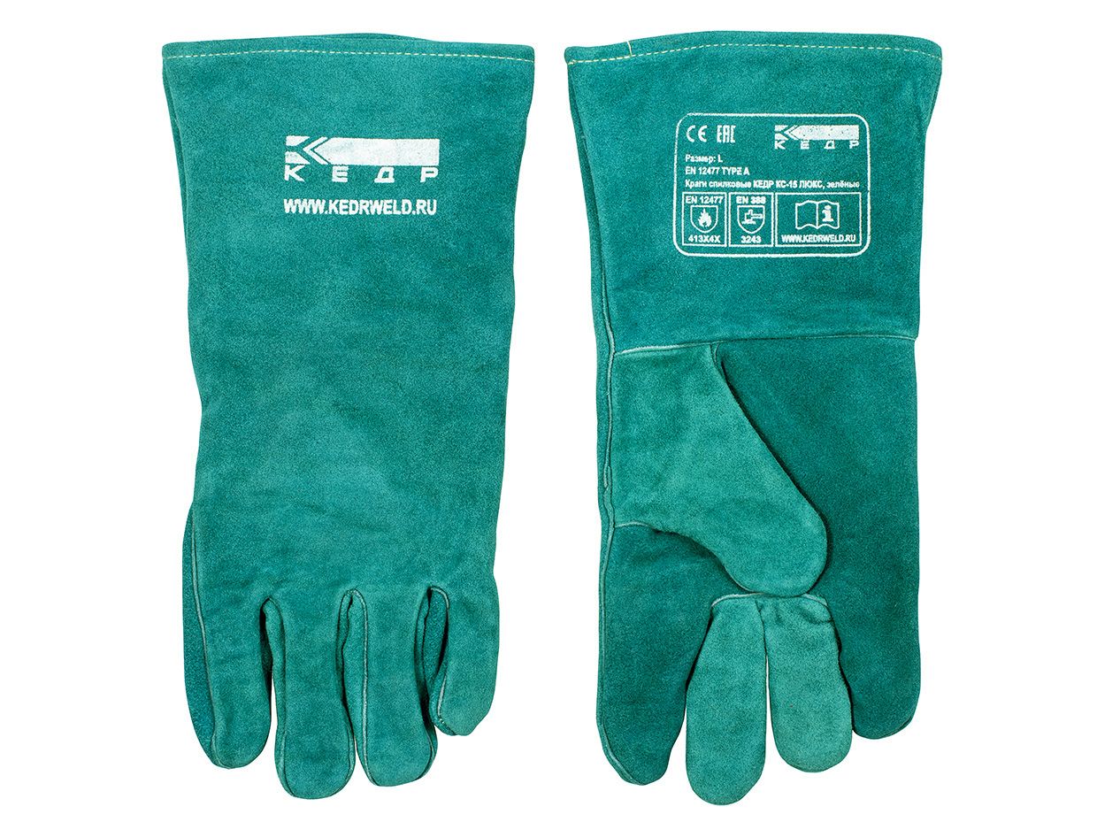 Краги спилковые КЕДР КС-15 ЛЮКС, зеленыеизготовлены из цельной коровьей шкурки толщиной 1,3 мм с ворсовой изнанкой и бесшовным указательным пальцем. Надежно защищают руку сварщика от брызг и ожогов, а также при работе со шлифмашинкой и острыми предметами. Обеспечивают максимальный комфорт.Обладают усиленной жаростойкостью.