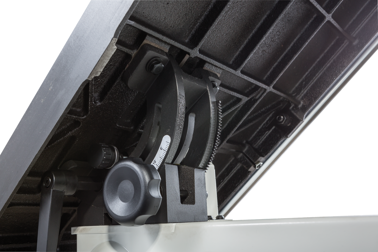 Рабочий стол чугунный, поворотные сегменты, на которые он опирается, из этого же материала. Наклон производится при помощи зубчатого механизма вращением рукоятки и возможен в обе стороны (на 5° в сторону станка и на 45° от него). Для наибольшей эффективности пылеудаления установлено два 100-миллиметровых патрубка: один под рабочей поверхностью, второй в нижней части корпуса.