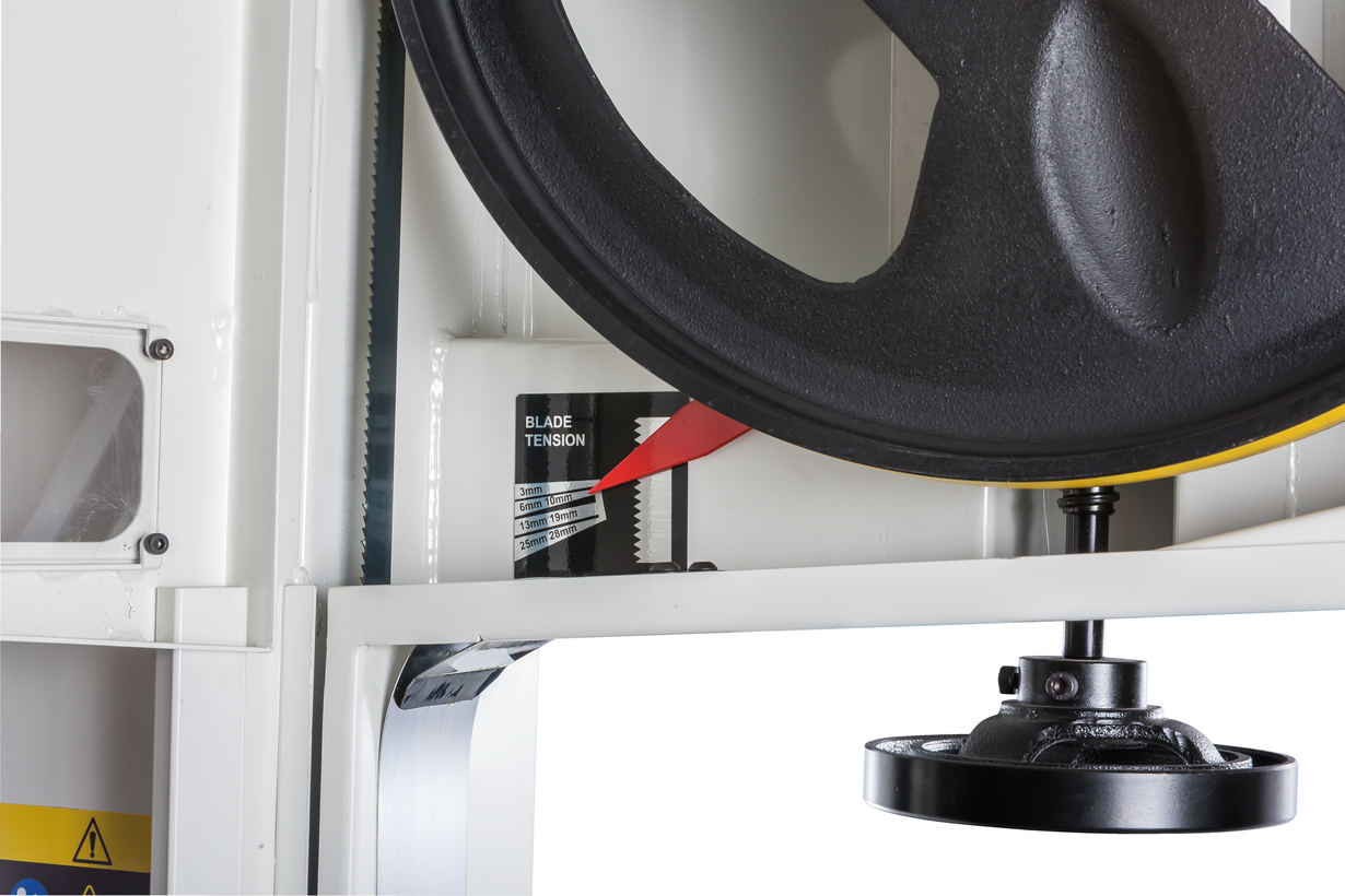 Механизм натяжения и центрирования ленты включает в себя две группы трехроликовых направляющих на шарикоподшипниках, стрелочный индикатор уровня натяжения, регулирующие маховики, два смотровых окошка и рычаг быстрого натяжения-ослабления. Он не совсем обычен, поскольку имеет не два, а три фиксированных положения: рабочее (плотно натянуто), для хранения (лента ослаблена, но держится на шкивах) и сервисное (для замены полотна). Чтобы улучшить плавность работы, использованы чугунные шкивы с массивным телом, а не в виде спицованных колес, как раньше.