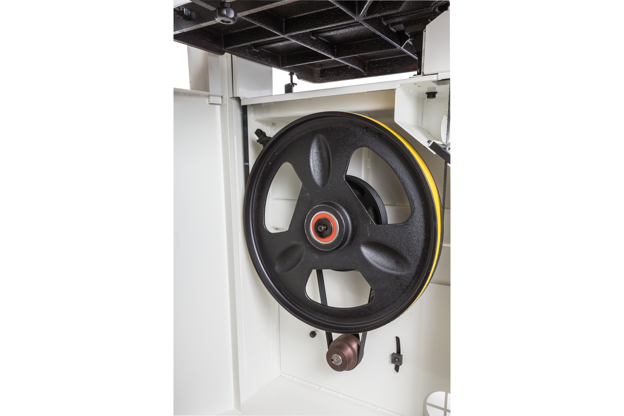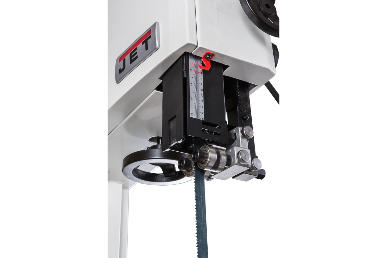 Jet JWBS-18 – новая ленточная пила для профессионального применения. Ее основное преимущество на фоне аналогов прошлых поколений – увеличенная высота распиловки. Этот параметр очень важен для тех, кому нужен универсальный станок, способный взять на себя функции делительного. К подобным работам приспособлен и параллельный упор: направляющий профиль можно установить вертикально на боковую грань так, чтобы надежно фиксировать плоские заготовки при их роспуске на тонкие пластины. В целом конструкция бокового упора очень хорошо проработана и соответствует самым строгим требованиям: профиль жесткий и прочный, закреплен на массивном чугунном кронштейне, который перемещается по цилиндрической направляющей. Предусмотрена грубая (вручную) и точная (микрометрическим винтом) установка.