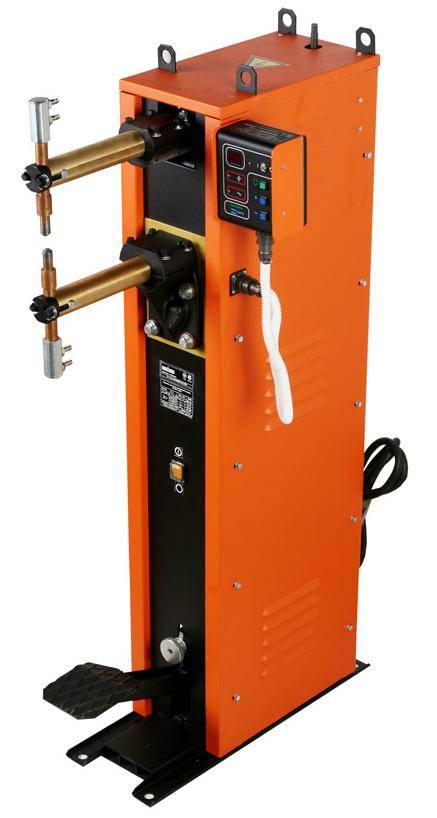 Машина состоит из вертикально расположенного корпуса, в котором установлен силовой блок, блок управления и система ножного педального привода сварочных электродов. Система привода оснащена регулятором усилия сжатия электродов, датчиком автоматической синхронизации момента оптимального сжатия и включения сварочного тока.