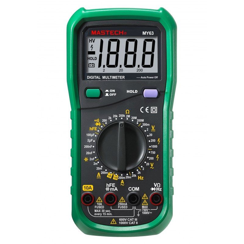 Цифровой мультиметр Mastech MY-63 измеряет величины силы постоянного и переменного тока, постоянного и переменного напряжения, сопротивления, коэффициента усиления биполярных транзисторов, емкость конденсаторов и частоту синусоидального сигнала в звуковом диапазоне. Высокое входное сопротивление не вносит погрешности при измерениях величин и говорит о высокой точности прибора. В приборе применен АЦП с измерением значений методом двойного интегрирования. Выбор пределов измерения величин производится вручную путем установки нужного положения многопозиционного переключателя.