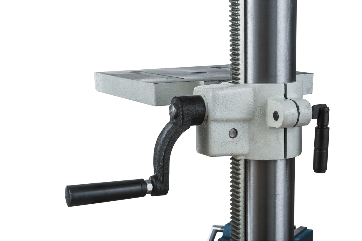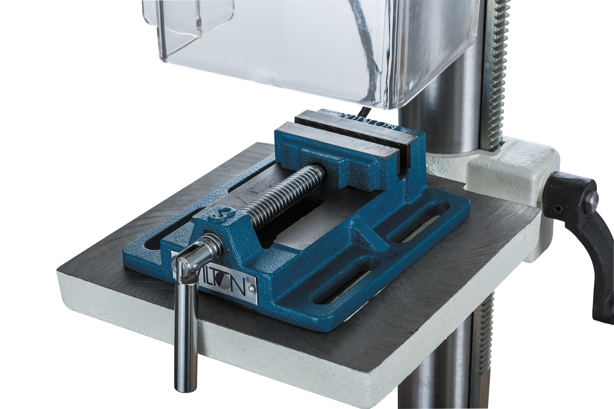 Рукоятка привода пиноли оборудована лимбом для контроля подачи и имеет встроенный ограничитель хода (глубины сверления). В штатный комплект поставки входят станочные тиски Wilton, для крепления которых предусмотрены пазы на столе и на опорном основании станка.