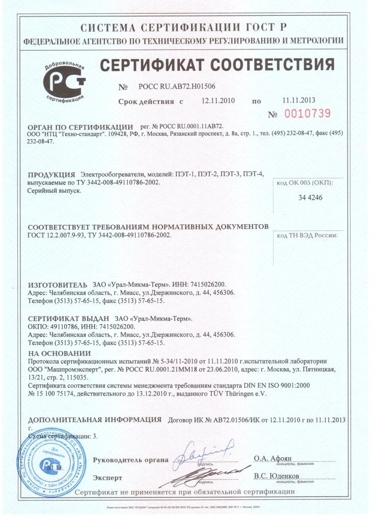 1. Конструкция электрообогревателя ПЭТ-4 в части защиты от поражения электрическим током соответствует классу 01 по ГОСТ 12.2.007.0-75.
