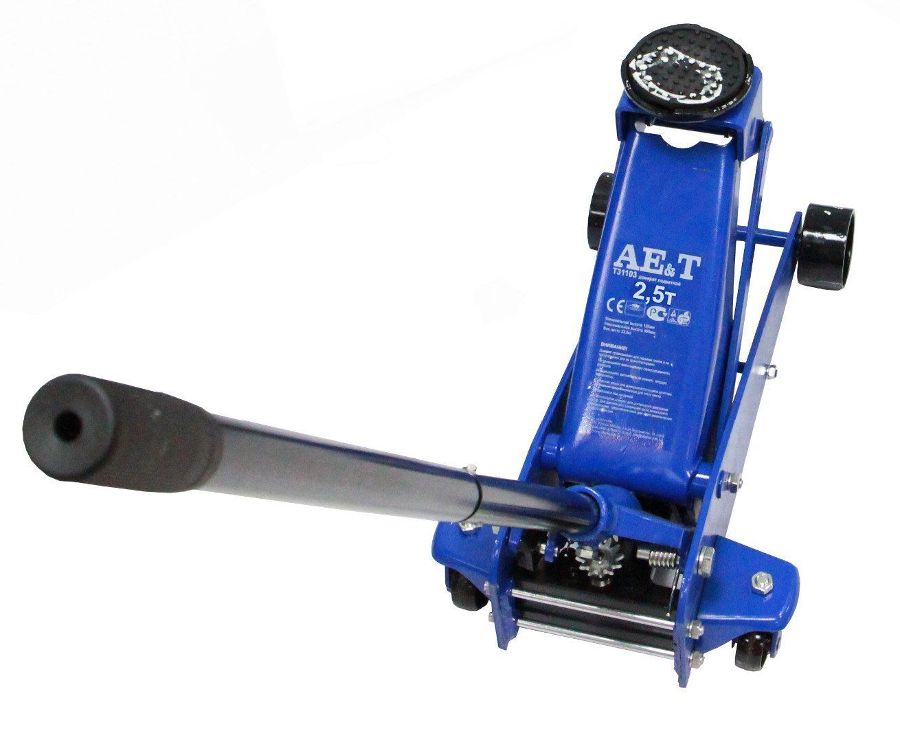 Домкрат подкатной AE&T предназначен для поднятия необходимой стороны автомобиля с целью его последующего ремонта. Максимальная масса поднимаемого груза 2,5 тонны. Удобство работы обеспечивают транспортировочные колеса, позволяющие расположить домкрат в необходимой для поднятия точки автомобиля. Поднятие происходит посредстрвом усилия оператора на рычаг гидравлического плунжерного насоса. Поворотная чашка для максимального комфорта в работе. Имеет устойчивую конструкцию. Масса 32 кг.