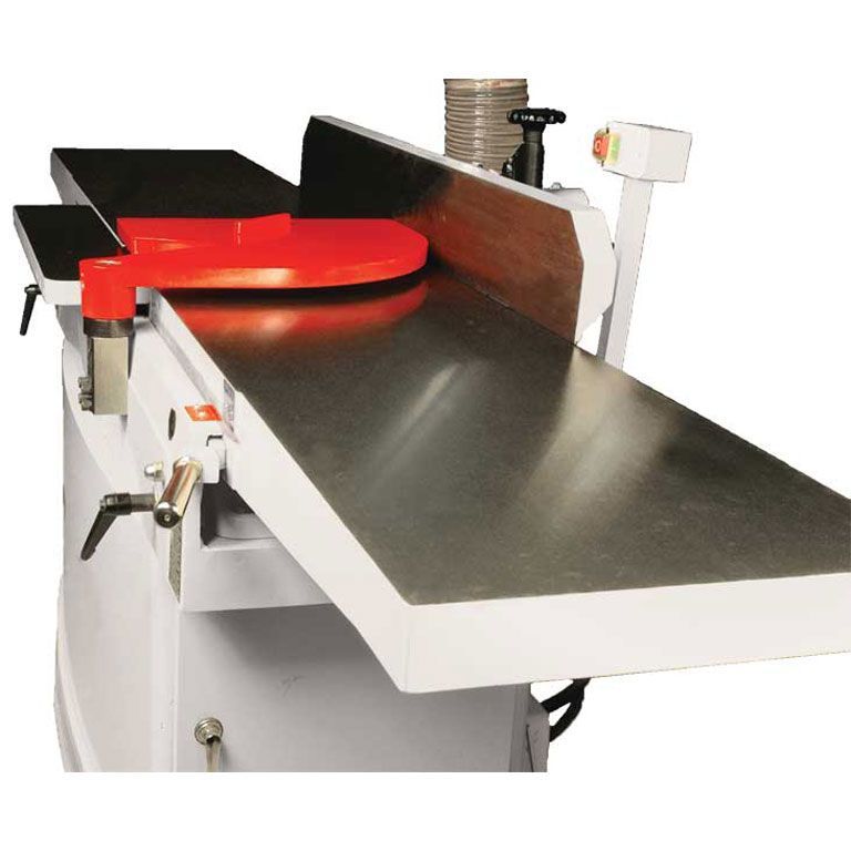При переходе с одного вала на другой, при замене ножей и в других случаях может потребоваться корректировка положения принимающего стола, такая возможность предусмотрена конструкцией. Есть отдельный стол сбоку от основного, предназначенный для выборки четверти глубиной до 19 мм. Регулируемый по наклону и вылету массивный фуговальный упор с простой регулировкой ограничителя угла установки, удобное поворотное ограждение строгального вала, 140-миллиметровый вытяжной штуцер – все эти особенности также характеризуют Jet PJ-1696 как производительный профессиональный станок, подходящий для промышленного применения.