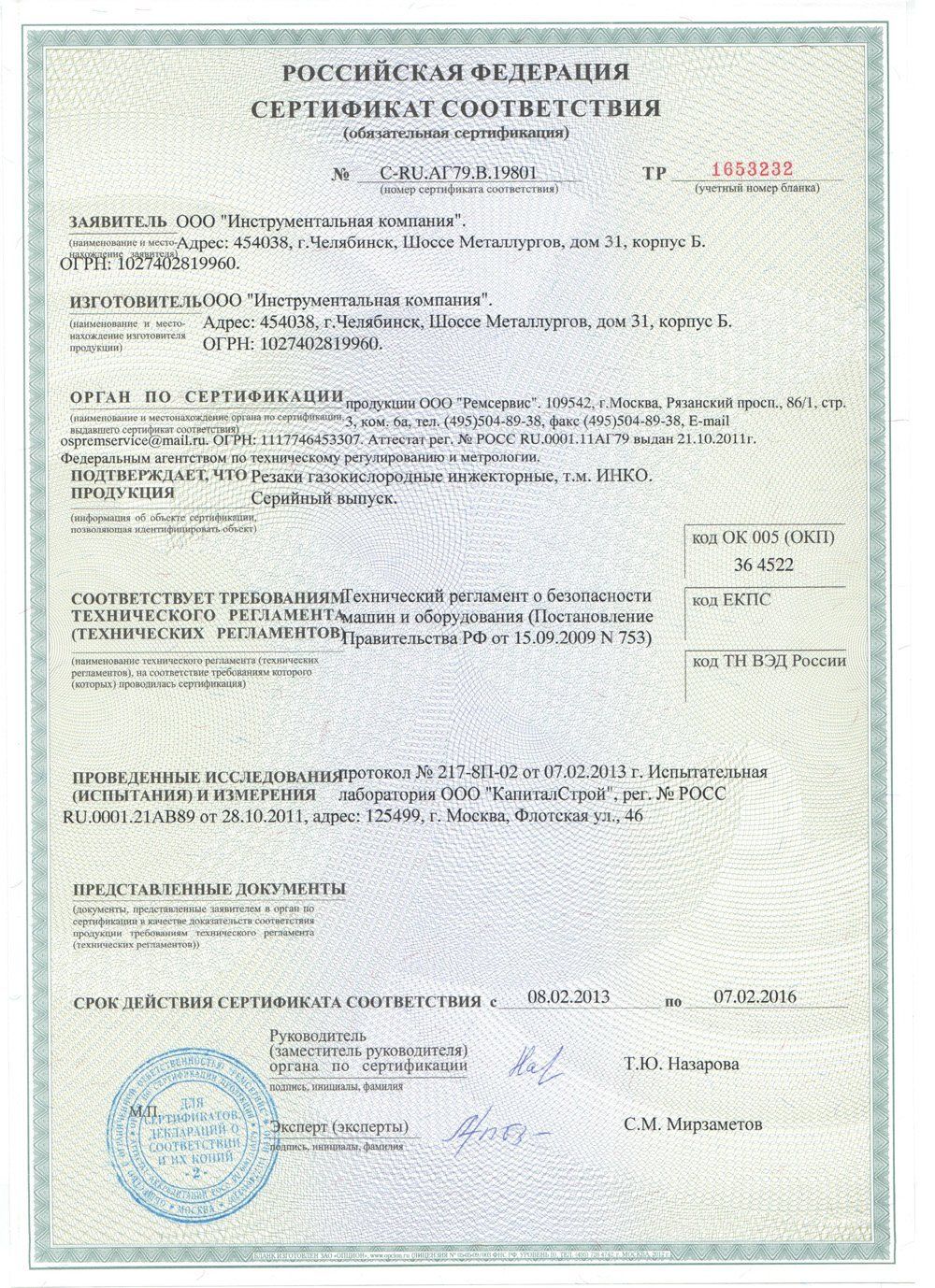 На всю продукцию имеются сертификаты качества. Резак удостоен серебряной медали на выставке "Сварка. Контроль и диагностика" в городе Екатеринбург.