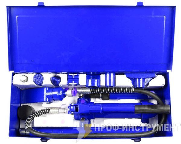 Комплект включает ручной насос и толкающий цилиндр, удлинители, распорный клин, несколько наконечников-упоров разной формы и резиновый набалдашник.
