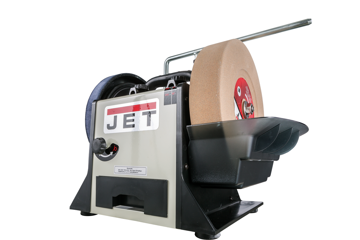 Jet JSSG-10 - шлифовально-полировальный станок для заточки, правки и доводки режущего инструмента (в основном ручного) с высокой точностью и без отпуска режущей кромки. Вал с кругами (абразивным, шлифовальным и кожаным полировальным) вращается с небольшой скоростью, которую можно регулировать при помощи рукоятки на передней панели станка. Шлифовальный камень погружен в ванну для смачивания водой.