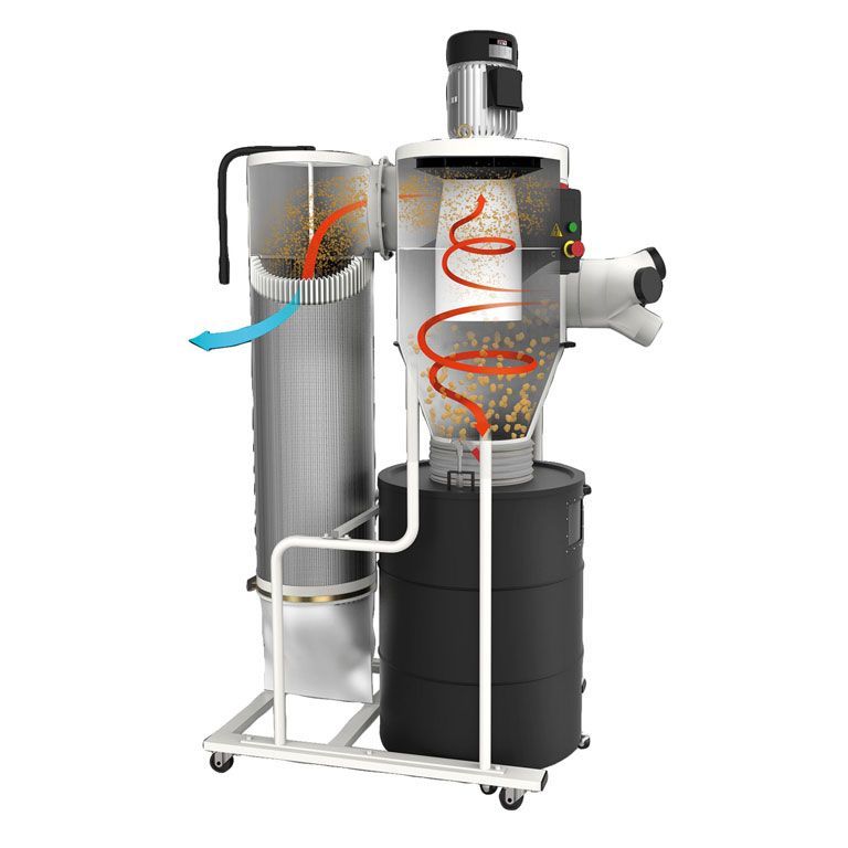 «Циклон» JCDC-1.5 обеспечивает постоянно высокую производительность. Его преимущества перед моделями с фильтром в виде мешка особенно заметны в сочетании с оборудованием для шлифовки, дающим много мелкой пыли. Гофрокартонный фильтр имеет большую (2 кв.м) площадь поверхности, оборудован рукояткой для стряхивания и очень долговечен. При работе со стружкой эффективность остается на высоком уровне – контейнер для крупной фракции имеет достаточный объем и очень легко извлекается/ устанавливается. Процедура проще, чем монтаж мешка с хомутом: «бак» на колесах подкатывается под крышку, после чего герметично ею накрывается; прижим производится одновременным движением двух рычагов. При утилизации крупной фракции мусора не приходится контактировать с мелкодисперсной взвесью, вредной для здоровья, пачкающей одежду, засоряющей мастерскую.