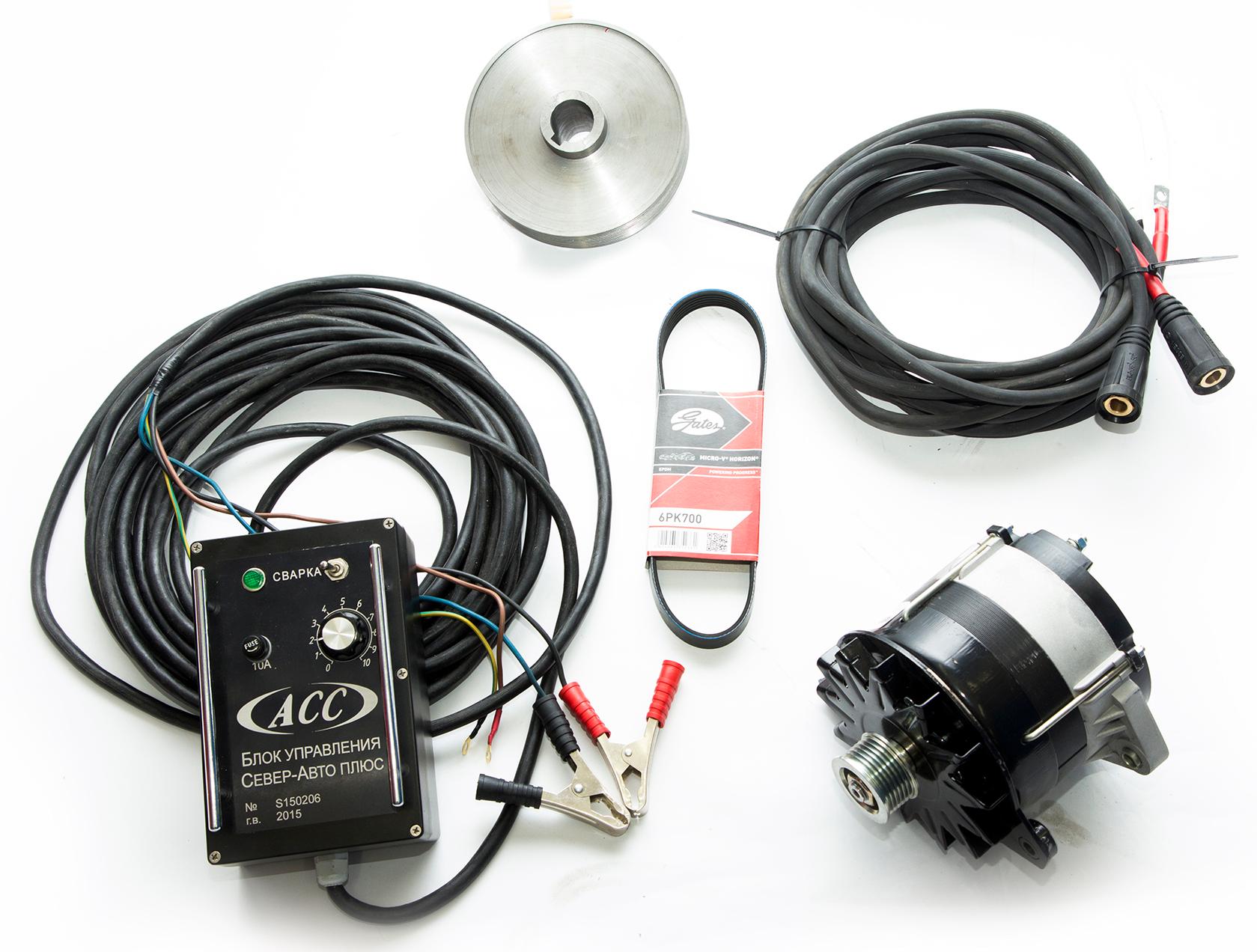 Набор состоит из сварочного генератора, блока управления, комплекта сварочных проводов, шкива на вал привода, поликлинового ремня и комплекта крепления генератора (разрабатывается отдельно под каждый тип двигателя).