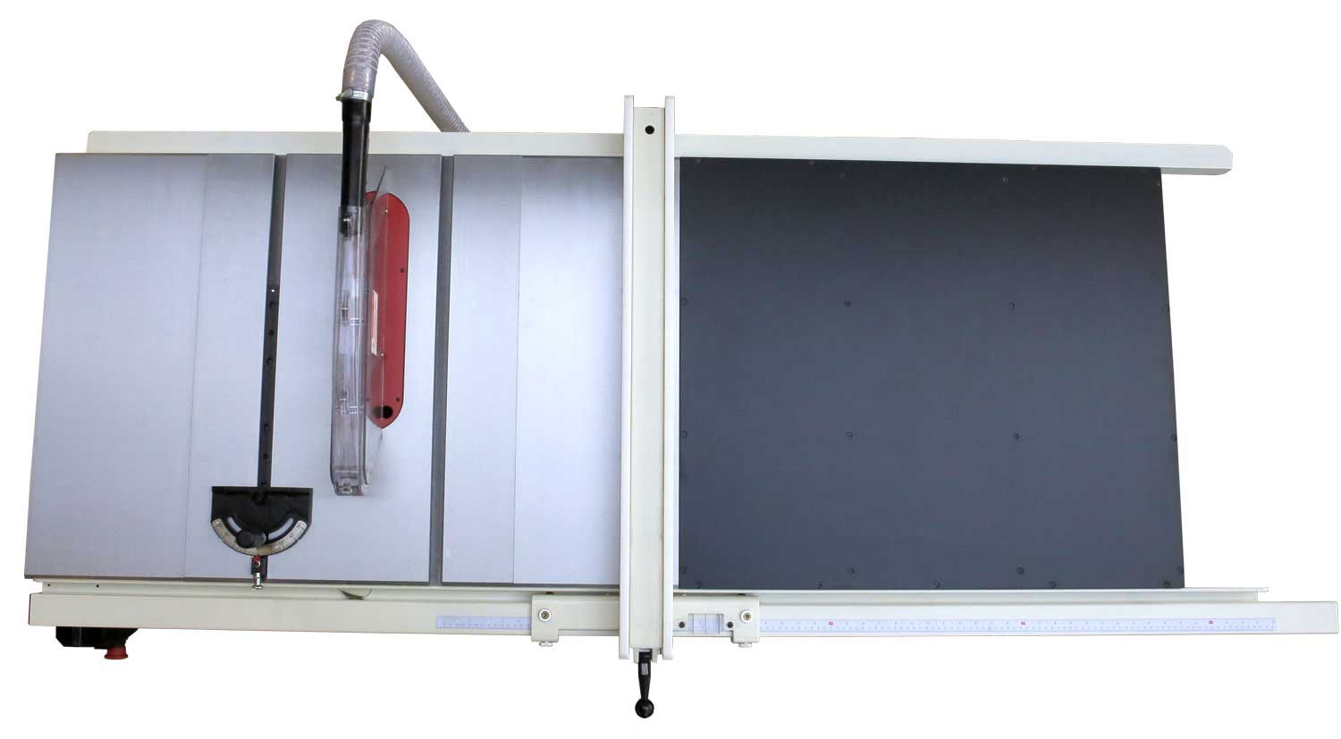 Пилу можно использовать не только с параллельным или угловым упорами, но и оснастить подвижным столом – кареткой. Она выполнена из алюминиевого профиля и навешивается вместо левого расширителя рабочего стола.