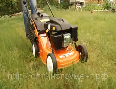Отрегулируйте высоту кошения травы. Для этого, с помощью рычага, установите каждое колесо по отдельности на необходимую высоту. Высота всех четырех колес должна быть одинаковая. Перед кошением обязательно осмотрите территорию, где вы будете работать. Уберите все предметы, которые могут попасть под работу ножа и повредить газонокосилку.